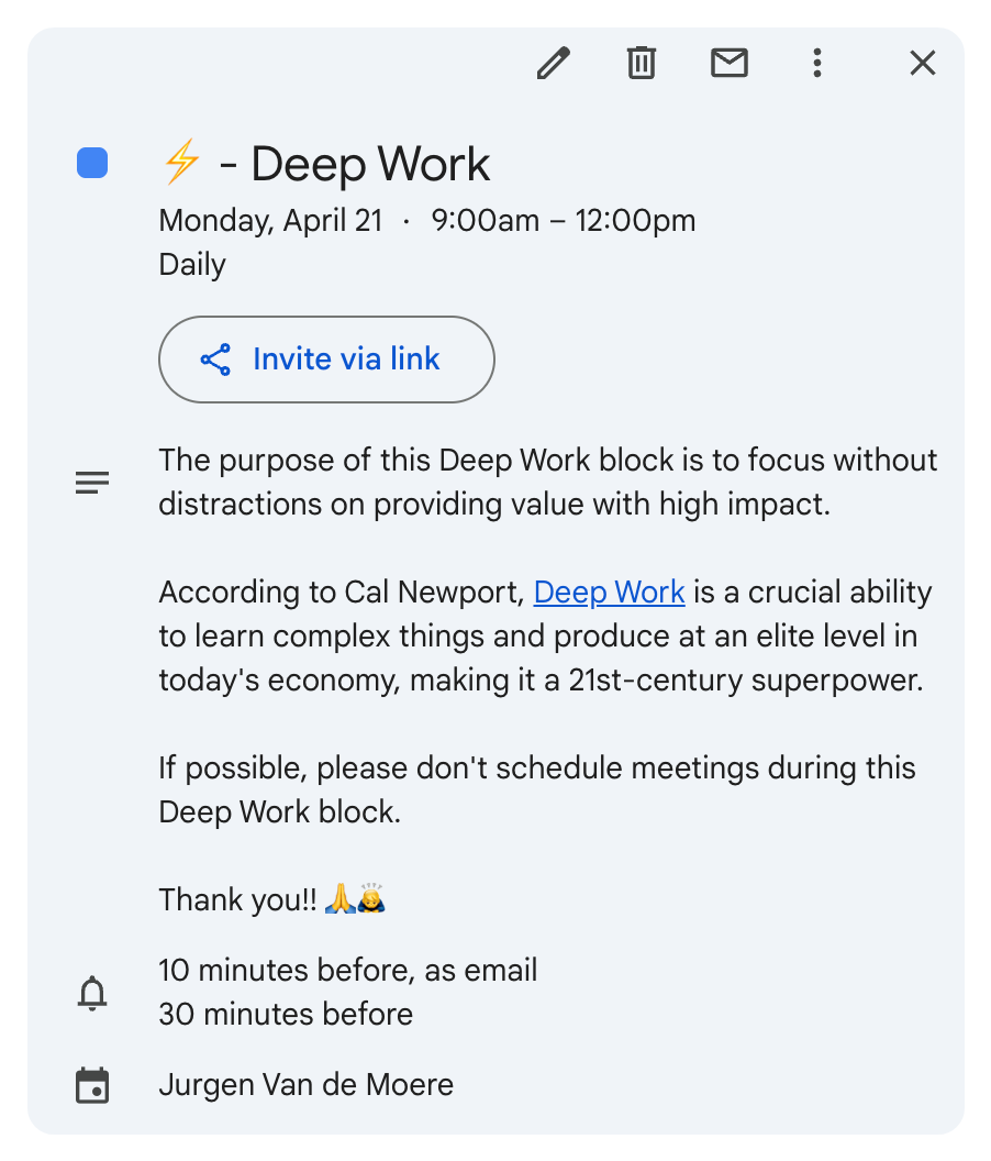 Here is an example of how I schedule Deep Work blocks in my calendar: