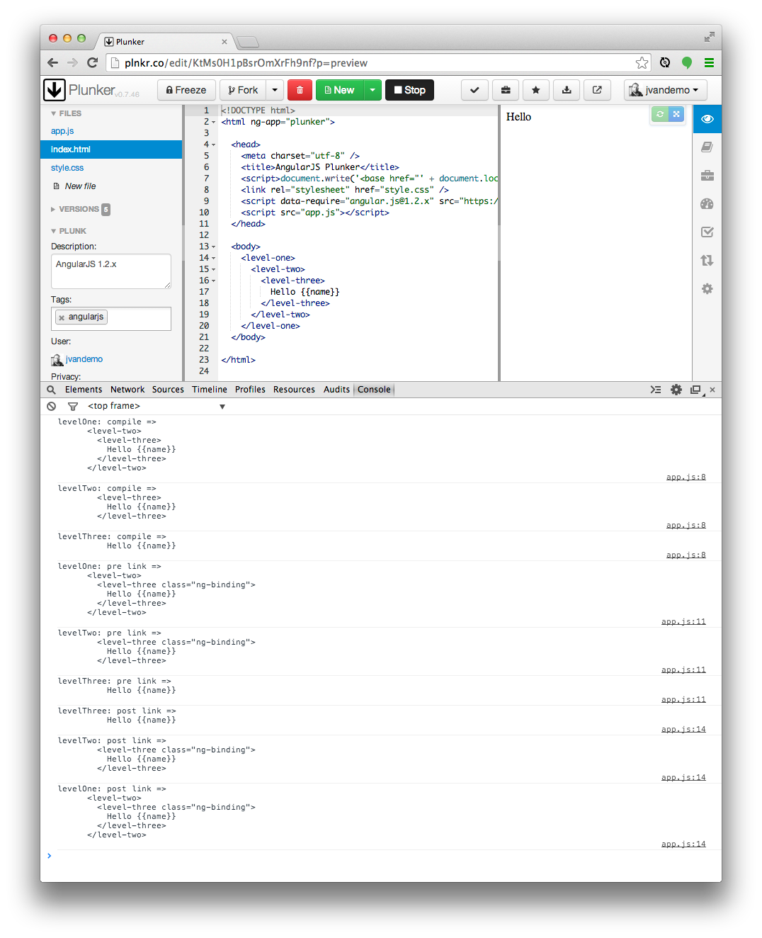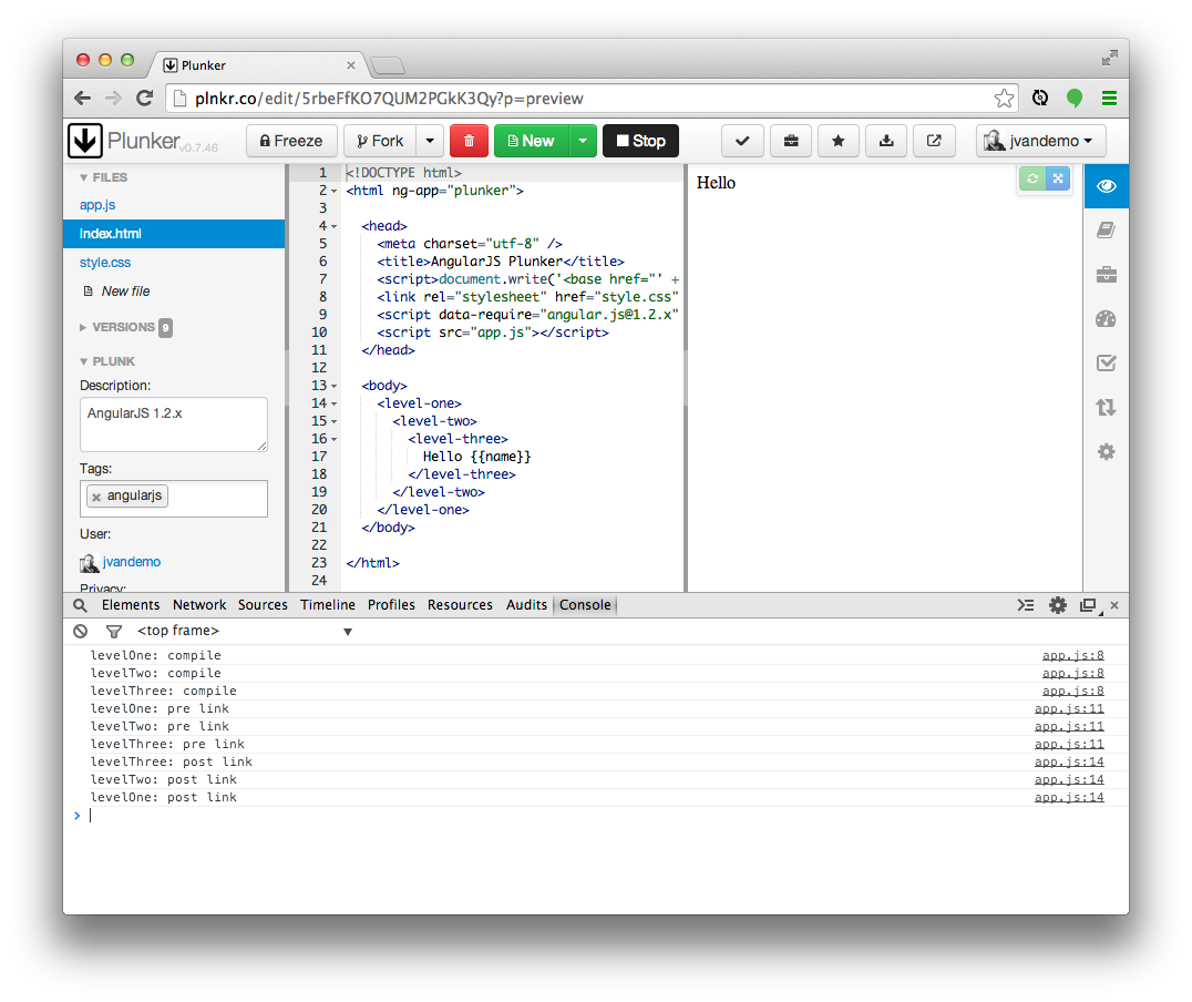 The goal is simple: let AngularJS process three nested directives where each directive has its own compile, pre-link and post-link function that logs a line to the console so we can identify them.