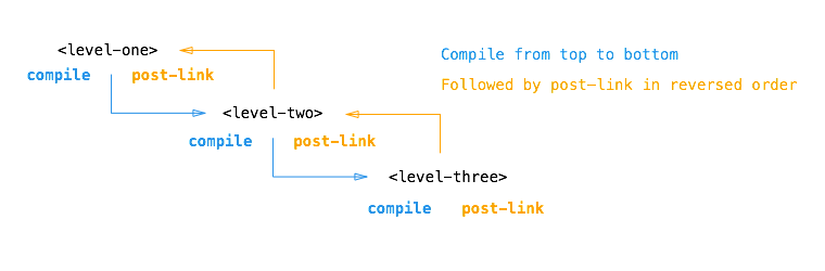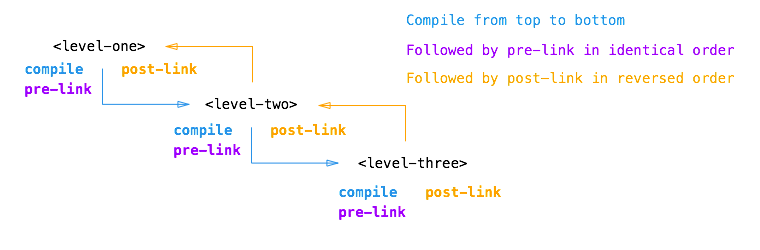 So when the post-link function of <level-one> is executed, we are guaranteed that the post-link function of <level-two> and the post-link function of <level-three> have already run.